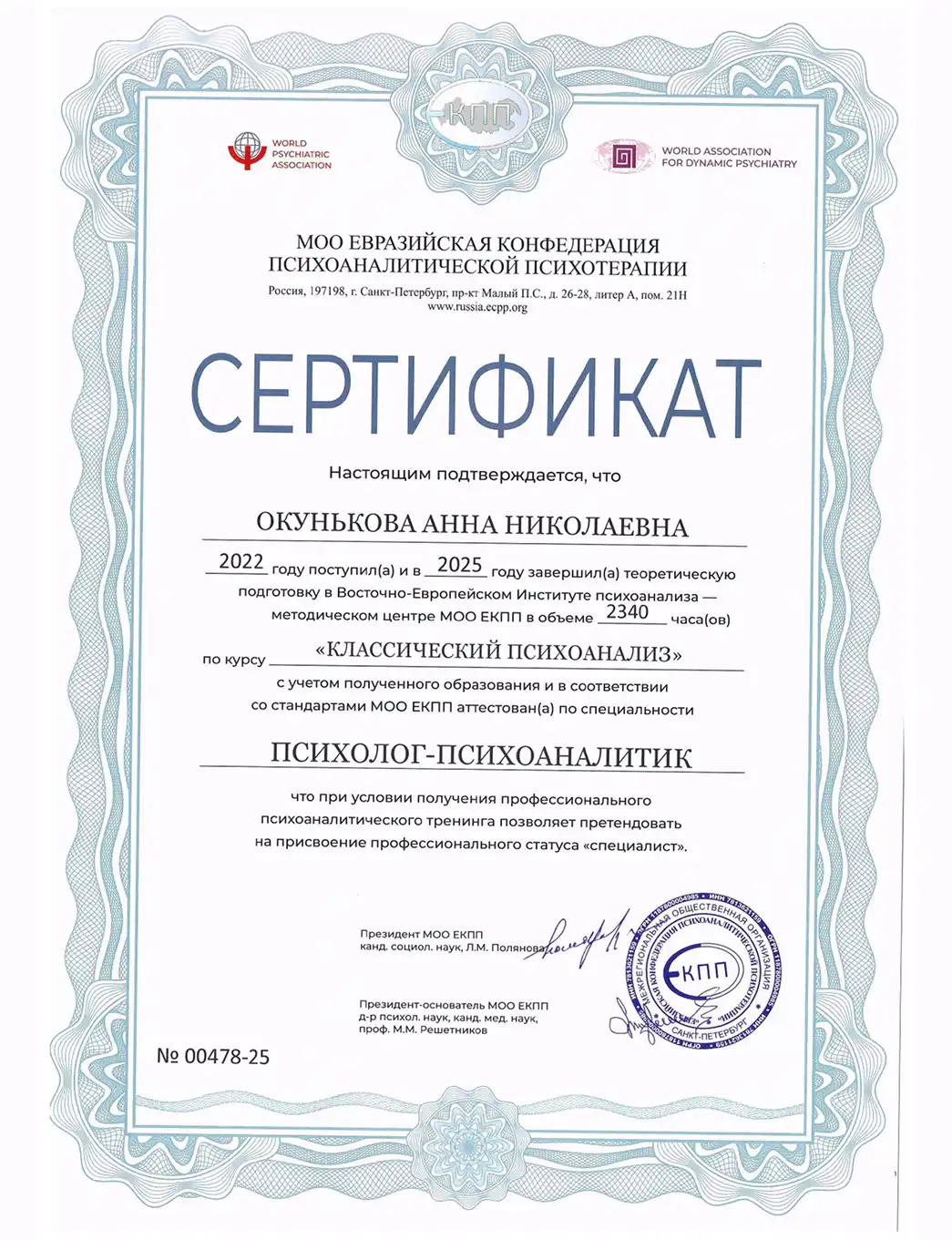 • 2022 - Мастерская современной психодраммы (Сертификат об обучении по программе "Основы психодрамы и индивидуальной психотерапии")